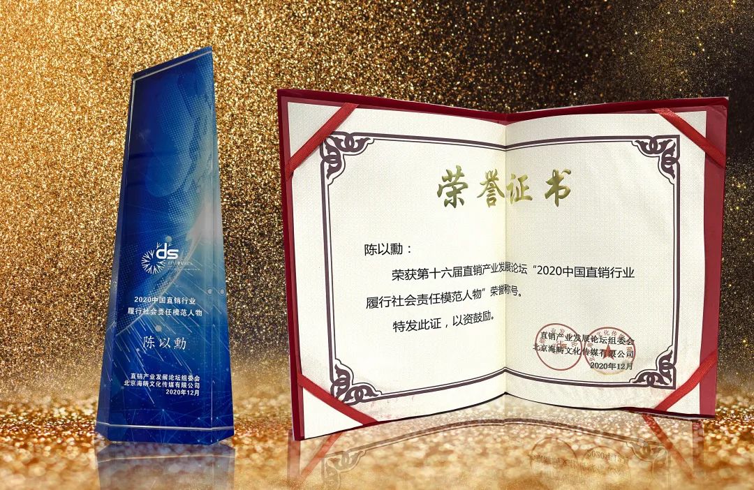 尚赫公益基金会理事长陈以勳荣获“2020中国直销行业履行社会责任模范人物”、尚赫公司荣获“中国直销30年行业影响力企业”荣誉称号。