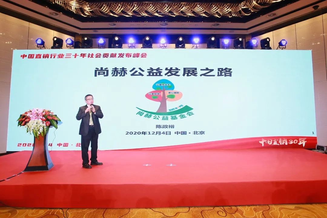 峰会现场设置了优秀企业代表、优秀从业人员代表的社会贡献成果分享环节。尚赫公司执行长特别助理、尚赫公益基金会秘书长陈政裕作为尚赫公司代表,发表了《尚赫公益发展之路》和《以尚赫为例 谈直销行业的可持续发展》两场主题演讲,向与会嘉宾分享尚赫公司在社会贡献方面及可持续发展方面所做出的成果。