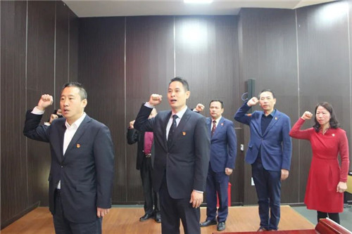 接下来,福建联合流动党支部成立授牌仪式正式开始。在全体新时代人奏唱国歌后,公司第二党支部组织委员兼纪检委员李秋杰首先宣读了福建联合流动党支部设立决定。黄勇书记向刘冉书记、王彦君总经理授牌,刘冉书记带领现场党员代表及全体党员重温入党誓词。