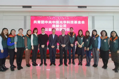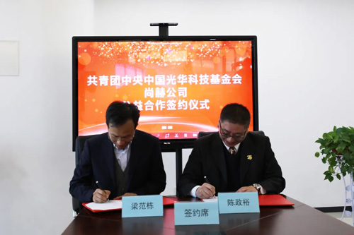 尚赫公司执行长特别助理、尚赫公益基金会秘书长陈政裕与共青团中央中国光华科技基金会副秘书长梁范栋分别代表双方签订公益合作协议。尚赫公益基金会理事长陈以勳通过“云连线”的方式,见证双方签约。