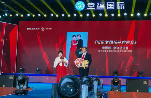 绿之韵国际商学院教育总监陈敏,国际商学院院办主任喻鸣鸾为“2020年度最具幸福力家庭”颁奖