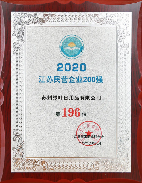 9月21日,在2020江苏民营企业百强发布会上,江苏省工商联发布“2020江苏民营企业200强”、“2020江苏民营企业制造业100强”,江苏省工商联、江苏省科学技术发展战略研究院联合发布“2020江苏民营企业创新100强”。数据显示,民营企业200强入围门槛达42.79亿元,绿叶科技集团荣登榜单。