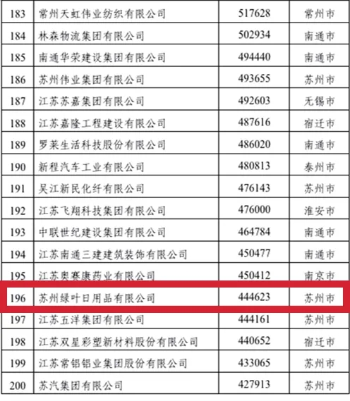 ▲绿叶跻身“2020江苏民营企业200强”第196位