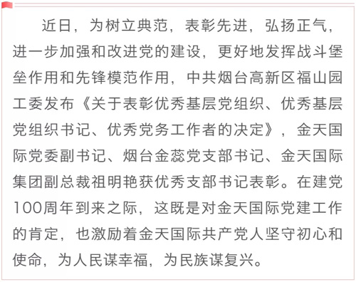 金天国际副总裁祖明艳荣获优秀支部书记表彰