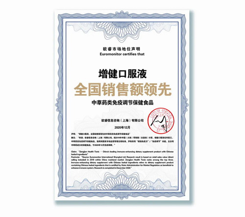 欧睿信息咨询(上海)有限公司,按2019年中国(大陆)零售额(含直销)计算,增健口服液位列前三。中草药类免疫调节保健食品,指得到国家市场监督管理总局批准,声称具有“增强免疫力”/“免疫调节”功能,且含有中草药成分的保健食品。于2020年12月完成调研。