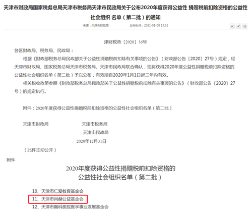 同时,天津市尚赫公益基金会获得天津市财政局、国家税务总局天津市税务局和天津市民政局公布的第二批公益性捐赠税前扣除资格的公益性社会组织。