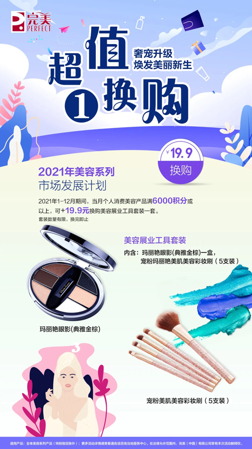 个人消费美容产品积分1个月满6,000分或以上,有机会以19.9元换购美容展业工具套装一套。