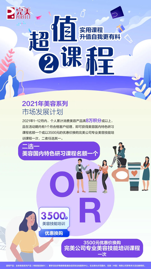 个人活动期内累计消费美容产品满8万积分或以上,且在活动期内有1个月合格客户经理,即可获得美容国内特色研习班名额一个或以3,500元的优惠价换购完美公司提供的专业美容技能培训课程一次,二者任选其一。