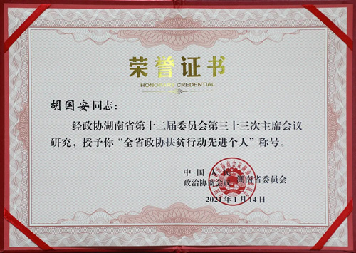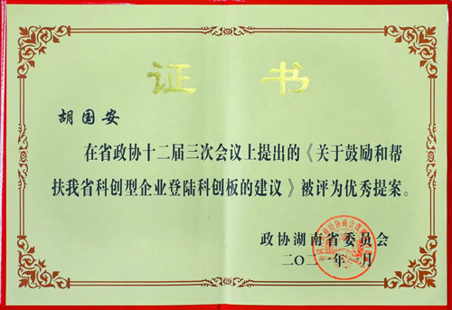 1月24-28日,胡国安委员出席湖南省政协第十二届第四次会议,被授予“湖南省政协扶贫行动先进个人”光荣称号。2020年提交的政协提案《关于鼓励和帮扶我省科创型企业登陆科创板的建议》被政协湖南省委员会评为“优秀提案”。