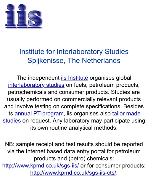 IIS是一家独立的能力验证组织机构,在全球范围内组织石油产品、石化产品、消费品及食品的实验室能力验证活动,为分析实验室提供各种类型的实验室间研究(能力测试、轮考、交叉检查、协作试验),参与实验室间研究的实验室遍布全球100多个国家,是国际权威的能力验证提供者。