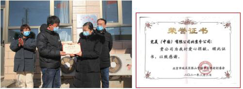 捐赠仪式上,防疫一线的妇女同志一一领取了爱心邮包,包括棉衣、手套、围巾、帽子等保暖物质共22份;村党支部郭燕虎书记为我司颁发了证书。此次爱心捐赠活动秉承了“奉献、友爱、互助、进步”的精神,为辛家堡村奋斗在一线的防疫工作者送去了温暖与关怀,形成了全社会关心抗议战士,助力防疫的良好氛围。