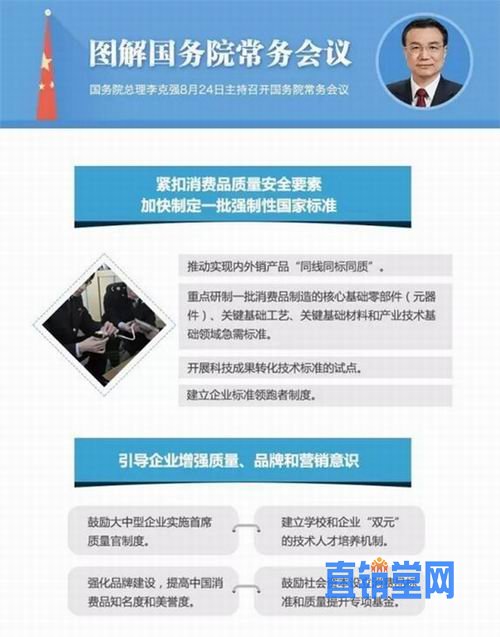 国务院总理李克强8月24日主持召开国务院常务会议。会议部署促进消费品标准和质量提升,增加“中国制造”有效供给满足消费升级需求。会上李克强总理对这些工作作出了哪些部署?