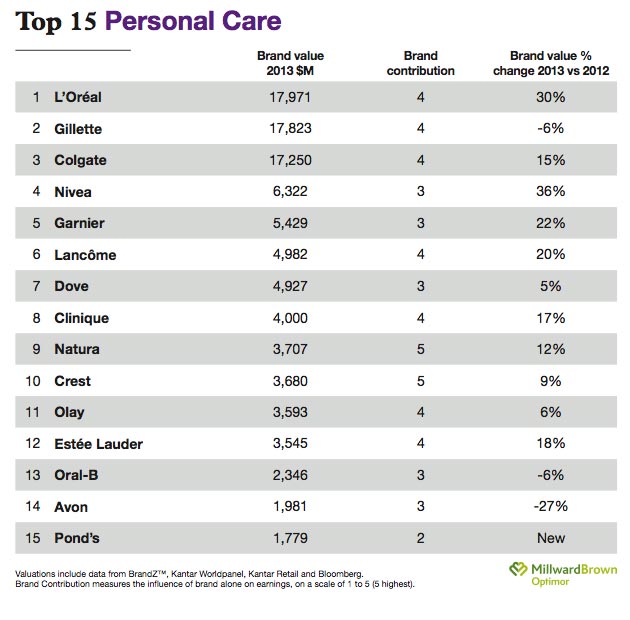 对比 BrandZ 今年5月发布的全球最有价值品牌榜单中的“个人护理类”品牌排名,区别还是相当大。(“个人护理类”中除美容,化妆品外,还包括头发和口腔护理用品,如吉列,高露洁等)。