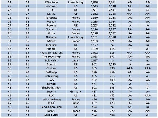 Brand Finance “全球最有价值的 50大美妆品牌” 第21-50名