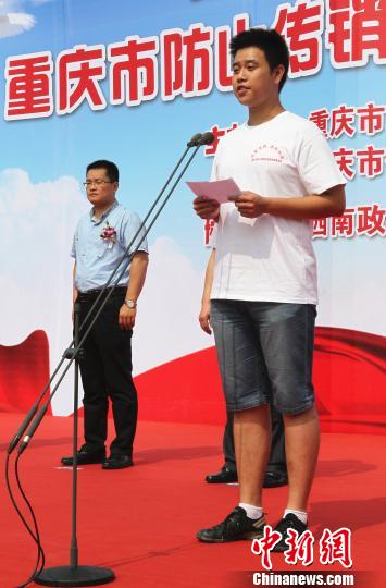 20日,重庆工商局在西南政法大学举办“远离传销、共创和谐”防止传销进校园宣传教育活动。活动旨在帮助广大学生增强意识、拓宽视野,让大家进一步认清传销的本质和危害,提高防范意识和抵御能力。图为:重庆西南政法大学“抵制传销自愿宣传队”的学生代表在台上发言。