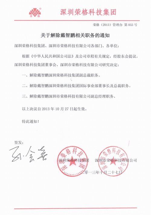 关于解除戴智鹏相关职务的通知