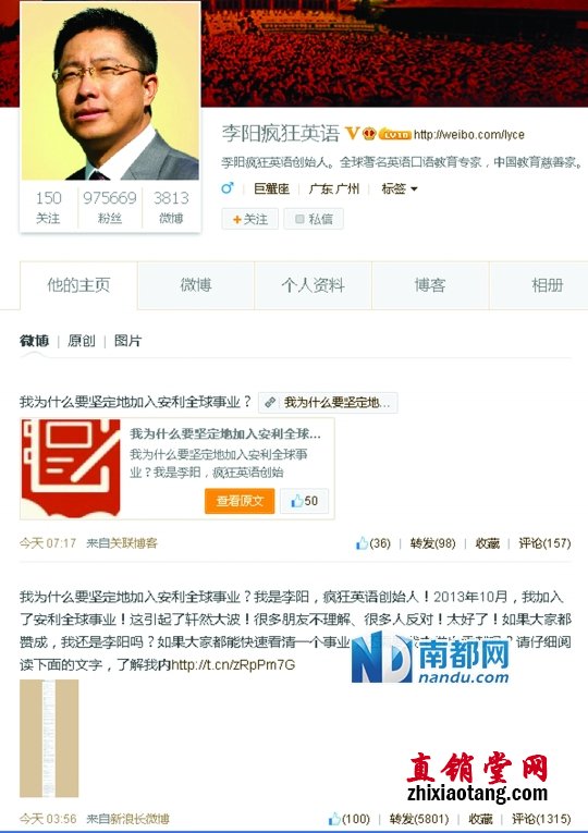 11月4日凌晨4时,疯狂英语创始人李阳发了一条长微博,证实自己加入安利。在1431字的长微博里,李阳用了79个感叹号,一如他演讲时的亢奋。他称自己“找到了灵魂的归宿”,安利的人才是“令人感动、不离不弃的真朋友”,并且用了安利产品后,“和美国太太的关系亲密了”。