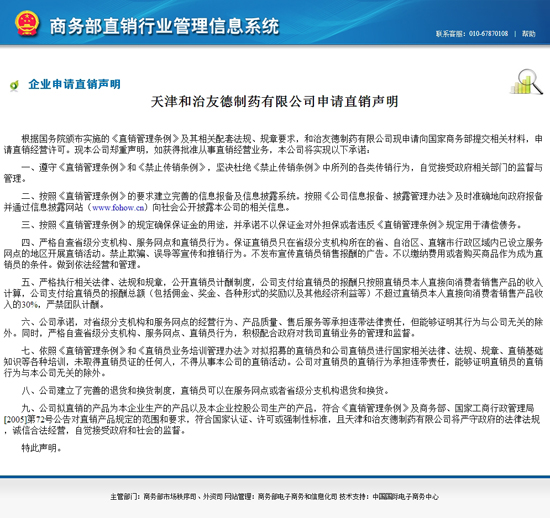 根据国务院颁布实施的《直销管理条例》及其相关配套法规、规章要求,和治友德制药有限公司现申请向国家商务部提交相关材料,申请直销经营许可。现本公司郑重声明,如获得批准从事直销经营业务,本公司将实现以下承诺: