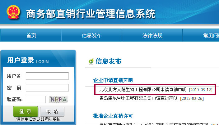 商务部网站发布北京北方大陆申请直销声明