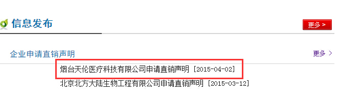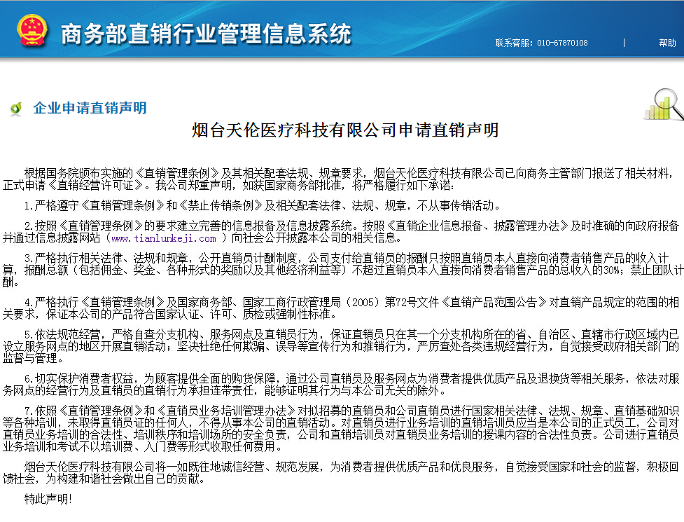 2015年4月2日商务部直销行业管理信息系统网站发布了烟台天伦医疗科技有限公司申请直销声明
