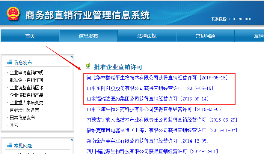 5月14日,国家商务部直销行业管理信息系统网站公布山东福瑞达医药集团公司获牌,5月15日,国家商务部网站连发两条获牌消息:河北华林酸碱平生物技术有限公司、山东东阿阿胶股份有限公司同时获得直销经营许可证。