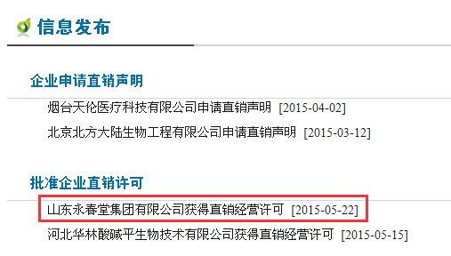 5月22日,商务部直销行业管理信息系统网站公示山东永春堂集团有限公司获得直销经营许可的消息。永春堂此次获批3类16总产品,获批直销区域山东省济宁市。同时获批两名直销培训员。详情如下: