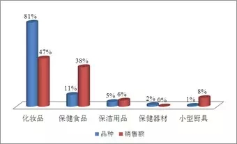 化妆品种类多销量大。直销企业共经营3393种直销产品。按类别划分,化妆品有2770种,是数量最多的类别,保健食品、保洁用品、保健器材、小型厨具等4类产品的数量相对较少,分别为377种、155种、60种、31种。拥有100种以上产品的企业有8家,低于20种产品的企业有18家,其中,最多的企业有681种产品,最少的企业仅有1种产品。销量方面,化妆品、保健食品两类产品销售额最大,分别为116.80亿元、95.83亿元,占销售总额的46.71%、38.33%。