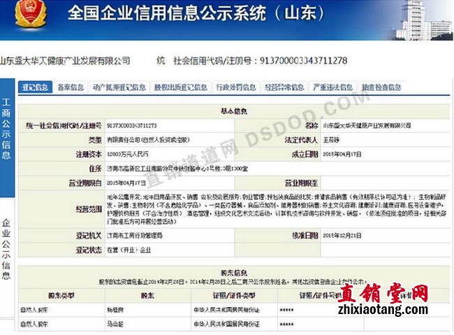 据了解,盛大华天是一家从事研究、开发和应用于人类大健康产业的大型综合性高新技术企业,主要有生物科技、养生养老、文化旅游、生态农业、移动互联、金融资产和国防教育七大产业。另外,据直销道道网从全国企业信用信息公示系统查询到,山东盛大华天健康产业发展有限公司成立于2015年04月17日,核准日期则为2015年12月21日,注册资本1.2亿元人民币,法定代表人为王茹铮。