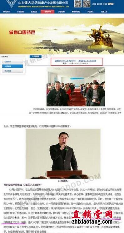 据《直销报道网》报道,12月25日,山东盛大华天健康产业发展有限公司在其官网发布了一则题为《感恩同行2015心手共进2016——市场领导人扩大会议召开》的新闻,该新闻内容提到,盛大华天董事长王茹铮宣布公司将在2016年1月16日前获得商务部直销牌照公示。看到这里,相信许多业内人士都会有一个大大的问号:盛大华天是何方神圣?