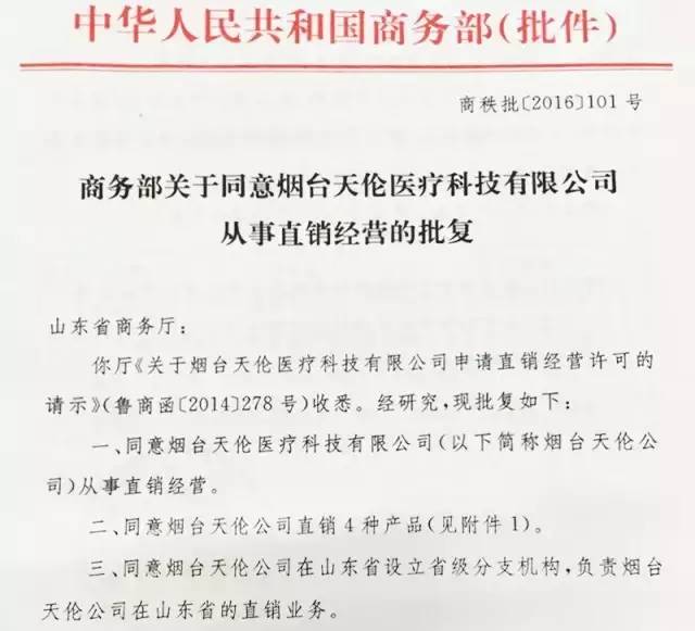 据金天国际集团官方微信公众号显示,金天国际之核心企业——天伦医疗科技正式接到商务部批复,荣获国家十三五规划开篇之年的首张直销许可证。