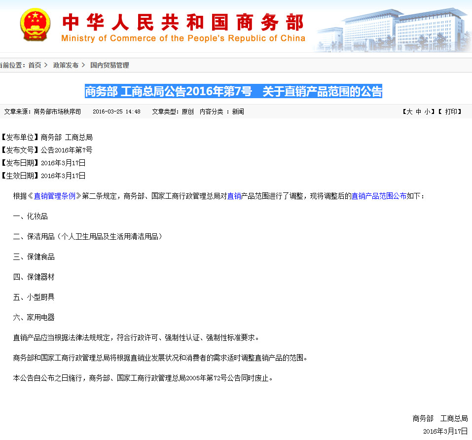 从昨天下午开始,商务部、工商总局联合发布的一条公告信息瞬间刷爆朋友圈,那就是直销产品范围由之前的五大类:化妆品、保洁用品、保健食品、保健器材、小型厨具,新增了家用电器成为直销行业第六大类产品!