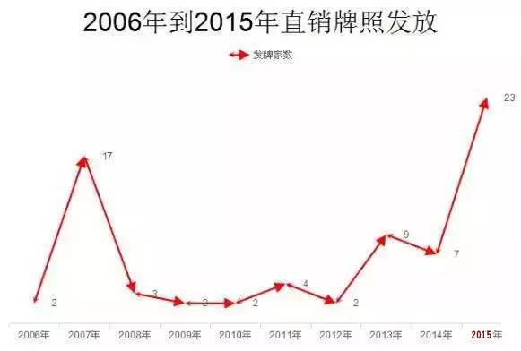 禁传到2005年《直销管理条例》出台,2006年7月24日雅芳(中国)获得第一张直销牌照开始,头两年发放19张牌照(多数是外资企业),之后的5年每年发放2到4张牌照,7年累计发放32张牌照,从2013年开始明显加快发牌速度,2015年商务部发放23张直销牌照,创历史之最!让你看到国家对直销的大力支持,直销不再是趋势而是现实!截止到2016年2月共发了71张直销牌照。