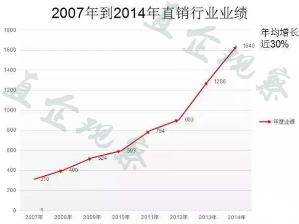 2007年到2014年中国直销行业持续保持高速增长,年均增长近30%(同期GDP增速年均8%)。中国直销即将赶超美国,成为世界第一!