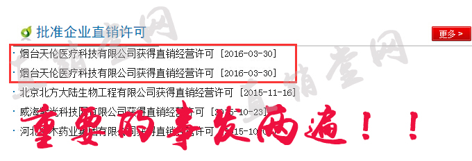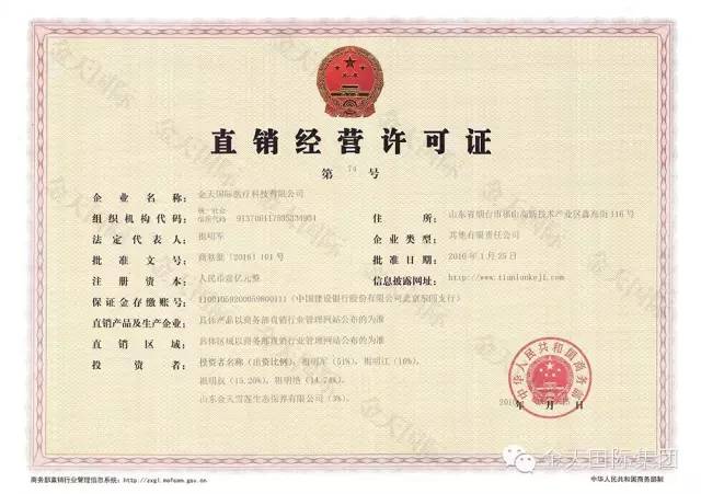 2016年3月30日,金天国际医疗科技有限公司(原烟台天伦医疗科技有限公司)直销许可网点审批备案工作顺利通过了国家商务部的严格审核,获得正式公示。值此,金天国际正式成为国家十三五规划开篇之年的首个直销许可企业。