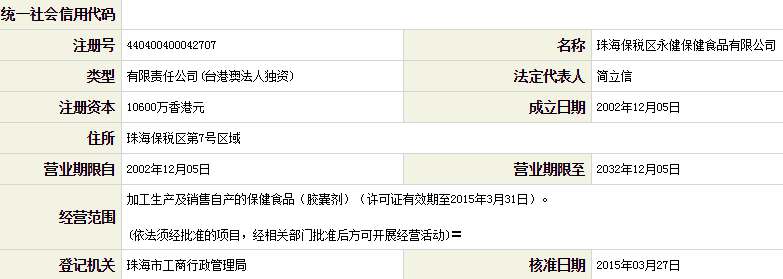 珠海保税区永健保健食品有限公司,主要经营加工生产及销售自产的保健食品。公司于2002年12月5日在珠海工商局登记注册,业务经理是邝林生 ,公司注册资本300万元,今年升级注册资金10600万港币。我公司的办公地址位于珠江口西岸的核心城市,幸福之城珠海,广东珠海保税区管委会综合楼604室,在职员工19名,我们有最好的产品和专业的销售和技术团队,在公司发展壮大的13年里,我们为客户提供最好的产品、良好的技术支持、健全的售后服务,珠海保税区永健保健食品有限公司是珠海营养、保健食品厂行业知名企业。