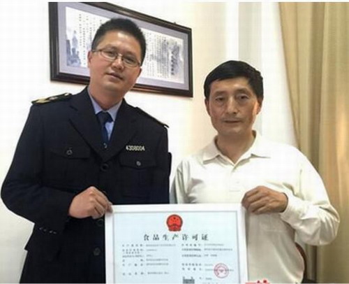 张家界市食药监局局党组成员、副局长李朝晖向慈利县众旺农产品开发有限公司颁发了新版《食品生产许可证》