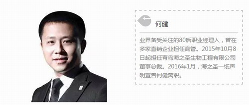 据曾在海之圣任职的人员透露,其实从2015年10月后,海之圣公司对直销的拨款就开始出现拖延等情况,而公司直销业务的开展却仍旧在按照相关合同进行。2015年12月,海之圣公司以缺钱为由拖延工资的发放,并对何健团队的管理、运营等提出质疑,同时邀请了两位顾问参与管理公司事务。2016年1月17日,海之圣在公司官网发布了“何健以个人原因申请辞职”的公告。