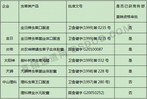 首先来看一下,目前直销企业涉足虫草类产品的一些状况: