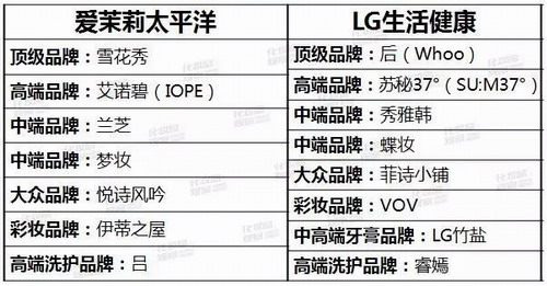 为什么要用到“全面”这个词呢?因为无论是爱茉莉还是LG,它们在中国都不仅只派出一名猛将单打独斗,而是从高端品牌到大众品牌,甚至在彩妆、日化领域也都有布局。因此它们的对决也是多品牌、多渠道、多维度的。
