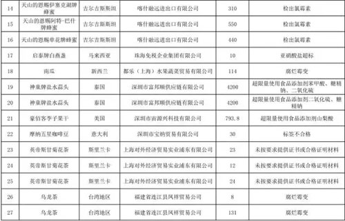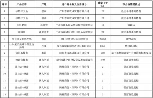 由沃尔玛(中国)投资有限公司进口的1批产地为“韩国”的成京海苔因菌落总数超标被退货。由深圳市澳中联合投资发展有限公司进口的1批产地为“澳大利亚”的澳蜜我蜂蜜因菌落总数超标被退货。