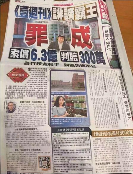 据资料,霸王在原审时索赔达6.3亿元。案件至本年五月底审结,高院颁下长达269页判词,指涉案撰文记者作出不负责任的报道,裁定《壹周刊》败诉,需赔偿300万元,兼支付霸王八成讼费。