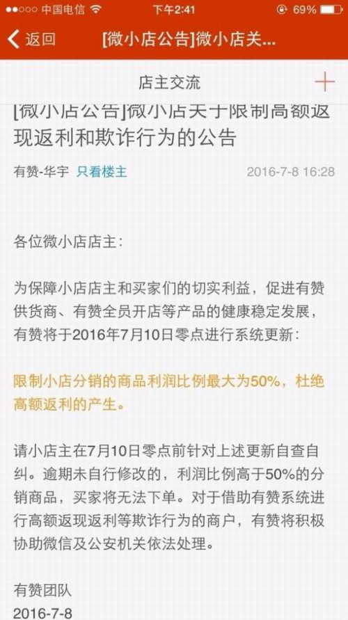 一位已入驻“有赞”的微商,最近在登陆商城后,收到了这样的通知:
