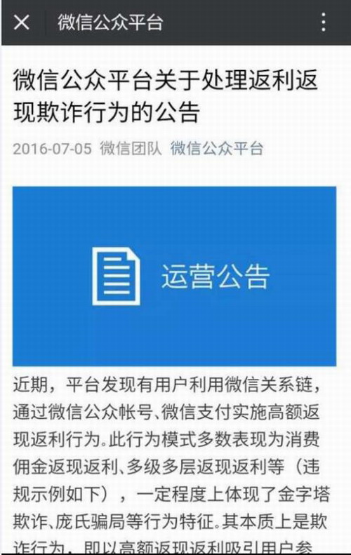 事实上,7月5日,微信公众平台就发布公告严肃处理返利返现欺诈,称此种行为一定程度上体现了金字塔欺诈、庞氏骗局等行为特征,本质上是以高额返现返利吸引用户参与、以新人用户资金来支付原有用户的返现返利,形成压层式资金链条。