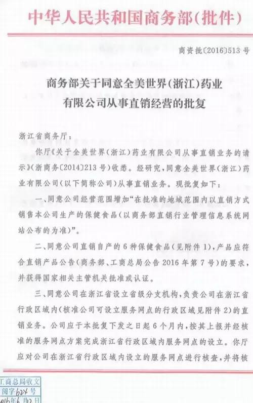 2016年6月,一则《商务部关于同意全美世界(浙江)药业有限公司从事直销经营的批复》在网络上不胫而走,引起业界广泛关注。