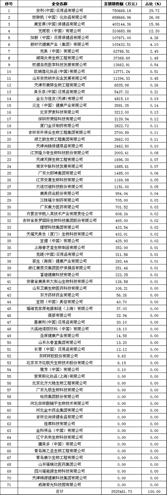 直销企业直销销售额排名
