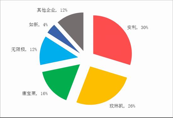(二)市场集中度逐步缩小。2015年,直销销售额前五位的企业占全行业88.2%的市场份额,行业集中度依然较高,但比2014年下降7个百分点。外资企业市场份额依然高于内资企业,但内资企业市场份额扩张较快,从2014年的4.7%增至2015年的7.3%,提高2.6个百分点。