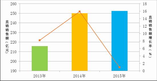 (一)直销额增速放缓。2015年,54家直销企业开展了直销经营,实现直销销售额252.5亿元,同比增长1%。直销主营率(直销销售额占企业销售总额的比例)为6%,同比下降1.36个百分点。直销主营率超过50%的有3家企业,较2014年减少1家。此外,54家直销企业通过经销商实现销售额776.20亿元。