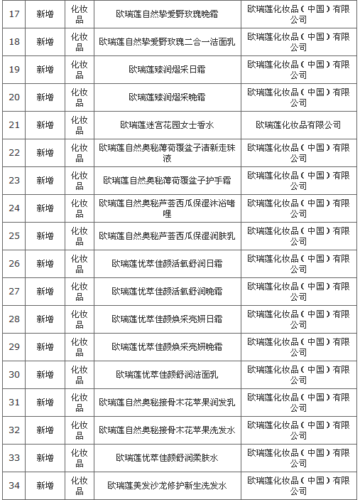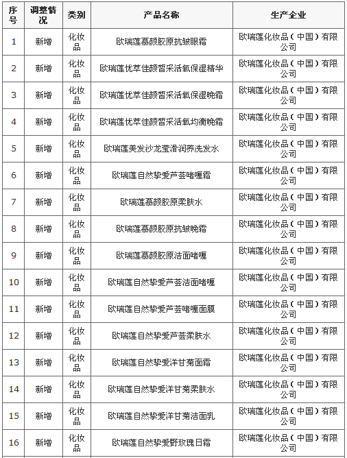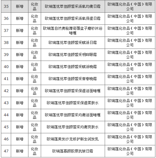 2016-11-18,商务部公布了欧瑞莲化妆品(中国)有限公司调整直销产品的信息,此次新增了47款化妆品,具体详情如下: