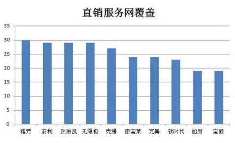 从直销服务网点覆盖区域上看,外资企业直销服务网点的覆盖区域远远超于内资企业。直销服务网点覆盖区域数量最多的前十位企业分别是:雅芳(30)、安利(29)、玫琳凯(29)、无限极(29)、克缇(27)、康宝莱(24)、完美(24)、新时代(内资23)、如新(19)、宝健(19)。外资企业中表现最为突出的是雅芳,遍布中国30个地区,除了港澳台没有纳入统计内,其他省份都可以看到雅芳的足迹。而前十位企业中,仅仅出现新时代这一家内资企业。