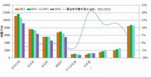常用白色家电如家用空调、电冰箱、洗衣机,由于保有量及市场普及率高,销量比较平稳,下图中曲线展示的年复合增长率均小于0,而像空气净化器、净水器、热水器、洗尘器等小家电销量确呈稳步攀升的态势。